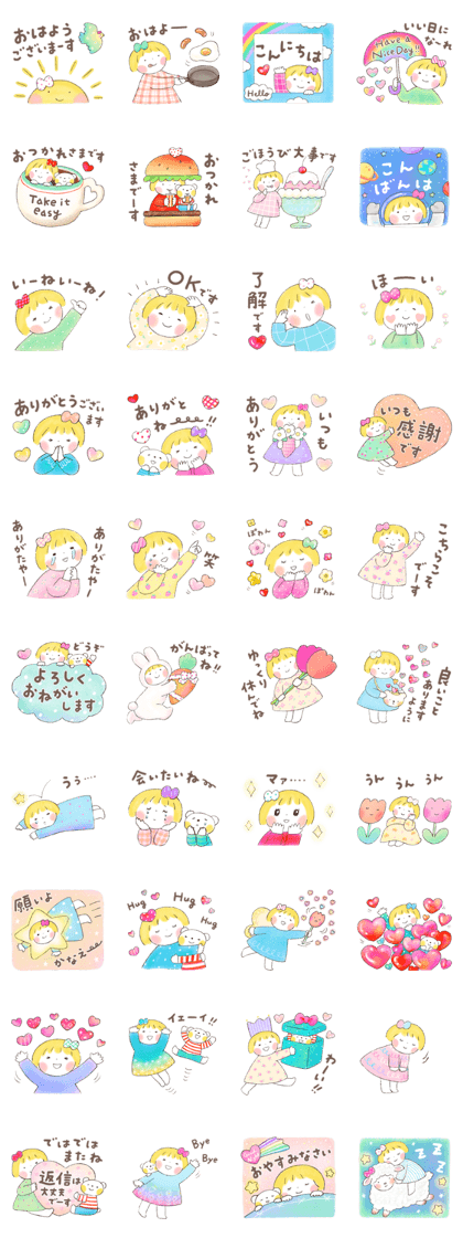 大変な事になって、みんなも外出を控えて、健康に注意していますね。いい事だとは思いますが、会いたい友達にも会えなくなって、寂しさで胸が切ないです。ラインで会いたい人に気持ちだけでも伝える事ができたら。そんな思いを「仲良しともだち ふんわりやさしい毎日」が届けてくれます。可憐に微笑む女の子やくまさんの表情や仕草、微笑ましさ、アットホームさに安らぎ、穏やかな気分に自然になれます。「ありがとうございます」の両手を合わせた感謝、「おつかれさまです」の労いのコーヒー、「がんばってね!!」の応援、「ゆっくり休んでね」等の優しさは森林浴のような心地良さに満ち、心癒します。「会いたいね~」の変わらぬ友情に心細さも解消!「いい日にな~れ」「良いことありますように」「願いよかなえ~」は、平和を祈るみんなの気持ち!心を支えてくれます。このスタンプは、フレンドリーな雰囲気が愛と真心を育み、頑張る勇気も湧きます。スタンプいっぱいに溢れる思いやりにヒーリングを感じ、人に優しいですね。この真心のあったかスタンプで冷えた心もお日様の日差しのように暖まります。(2021/02/24 18:51)