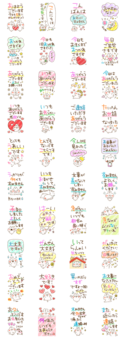 ただ可愛いだけのスタンプではなく、丁寧さ・気遣い・感情表現を同時に成立させている非常に完成度の高いスタンプである。過剰とも思えるほどの敬語が使われているにもかかわらず、ねことうさぎの柔らかい表情や間の取り方によって文章がまったく重くならず、「ちゃんとしているのに怖くない」という独特の空気を生み出している点が秀逸である。褒める、労う、謝る、お願いする、気遣うといったコミュニケーションに必要な要素が、1つのスタンプで自然に伝わる構成になっており、仕事のやり取りでもプライベートでも使える汎用性の高さを持っている。言葉で人間関係を壊さないためのバランス感覚が極めて優れており、スタンプという枠を超えた「文章ツール」としても非常に優秀な作品である。(2026/02/03 21:05)
