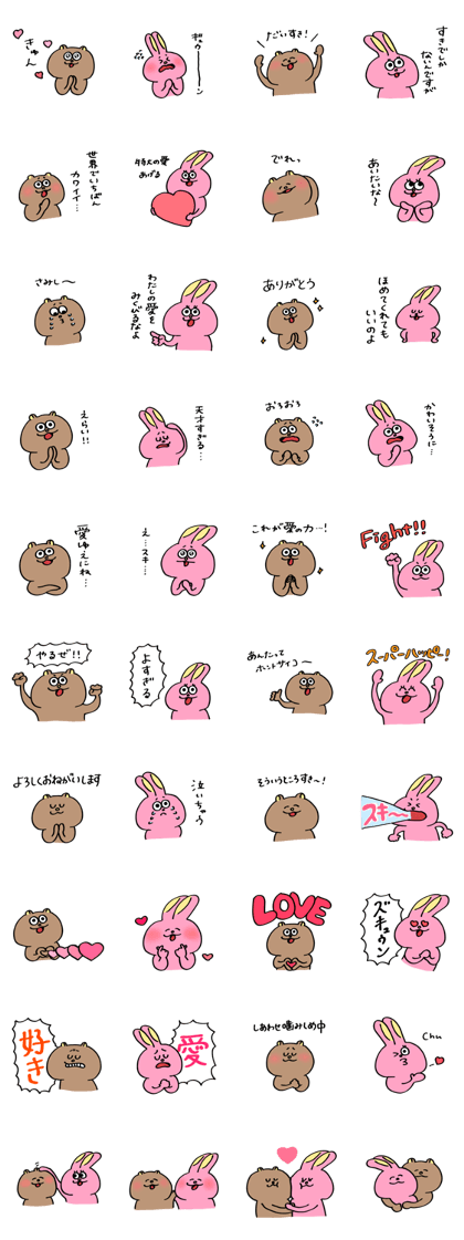 殺伐たる生活で人は愛を忘れたのか?確かにみんな余裕を失い、人を思う余裕もないけど、一人では心細くても愛するかけがえのない人に支えられ、頑張れてます。そんな思いを伝えるのが「クマチャンとウサギチャン(愛)」です。素敵なスタンプの自然な親しみが感受性に語りかけ、愛と優しさが心に宿り、頑張る勇気も湧きますね。愛し合うクマチャンとウサギチャンに安らぎ、ほのぼのと心ほっこり、自然に笑顔が溢れます。「ありがとう」は愛情への感謝!「えらい!!」は愛しい人への労い!「Fight!!」の激励は心の糧!「愛」は疲れた気持ちを快く回復させてリフレッシュ!「よろしくおねがいします」は愛を深め、「好き」の好意は心を浄化!「よすぎる」の喜びは希望を呼びます。愛する人に届けたい胸の内を綴ったこのスタンプは、愛と真心がα波となり、心を癒す抜群のヒーリング!まさにスタンプセラピー!逆境に負けぬ明日への英気を養います。お互いを思う麗しい気持ちがマイナスイオンとなり、心の距離感を縮め、心のこもったコミュニケーションで、血の通った愛情が守れ、更なる愛が込み上げます。(2023/01/11 17:57)
