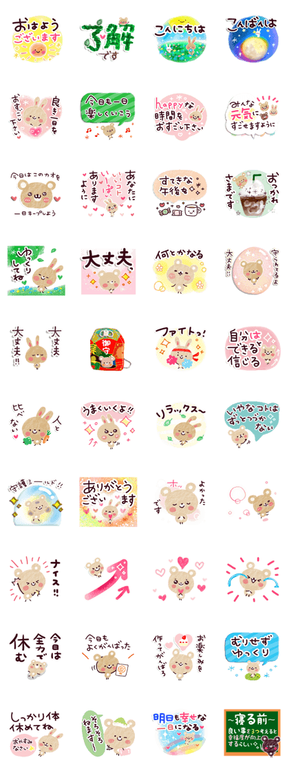 マイナスイオン~~!!だだもれ~~(IKKO風)ww「良い日をつくる♪スタンプ」は、毎日の会話にやさしい彩りを添えてくれるスタンプです。 森の中で暮らすような、かわいいウサギや小動物たちがとても愛らしいです。 やわらかな雰囲気のイラストが、見ているだけで心をほっと和ませてくれます。 前向きで温かいメッセージが多く、使うたびに気分が明るくなります。 挨拶や応援など、日常のさまざまな場面で活躍してくれそうです。 送る側も受け取る側も、優しい気持ちになれるのが魅力。 本当に“良い日”をつくってくれる、癒やしのスタンプ(⋈◍>◡<◍)。✧♡(2026/01/20 10:30)