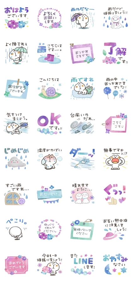 雨の日、送られてきたらちょっと笑ってしまうかも。そんな静かな明るさと可愛さがあるような。紫陽花カラーに包まれたキャラたちは、雨でも機嫌よく過ごしてるようで、こちらも救われます。どれも細部まで丁寧で、見ているだけで癒されるデザイン。「雨ですね」の一言に、これ以上ぴったりなスタンプはないかも。(2025/11/25 03:15)
