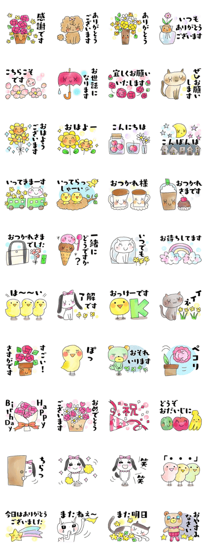 街は、規制も自粛も緩和・撤廃され、自由な雰囲気に活気づいてきましたね。でもまだまだ油断大敵!日々起きる悲しい出来事も心配!そんな緊張で強張った心をほぐしてくれるのが「ほっこり*やさしい*水彩*日常」です。厳しい現実で夢に憧れる人が心身を休める事ができるスタンプですね。しかも、美しく色映える水彩画風の可愛いイラストが真心のメッセージで歓迎しているみたいです。「ありがとうございます」のお礼に達成感や「おつかれさまです」の労いに満足感を感じますね。「おっけーです」の激励は心の糧!「どうぞおだいじに」の優しさでマイナスイオンが届いてリラックスできます。「宜しくお願いいたします」の親愛は心の距離を縮め、「ペコリ」の誠意に気持ちも浄化!「おめでとうございます」の喜びは希望への活力!様々な出来事でギスギスするときも、みんなにα波を運ぶこのスタンプのセラピー効果でリフレッシュできます。明日の英気も養え、お互い思いを通わす事で心が一つになりますね。協力して頑張れば幸せは必ず来ます。(2023/11/16 07:09)