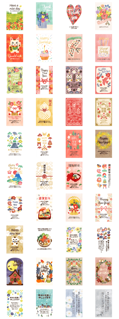 大きさを生かしたデザイン。長めのメッセージ。賑やかなものもありますが派手派手という感じではなく、絵もバラエティーに飛んでいるところが素敵です。日常グリーティングとありますが、年末や年間行事、喪などのスタンプもあるところに惹かれます。和柄で落ち着いたものもあれば、洋風なものもあり、とにかくまず、どれを送ろうと迷いそう!受け取った方も、特に誕生日などは大きなスタンプなので小さなサプライズプレゼントになるんじゃないかと、それを期待してます!(2025/10/06 01:40)