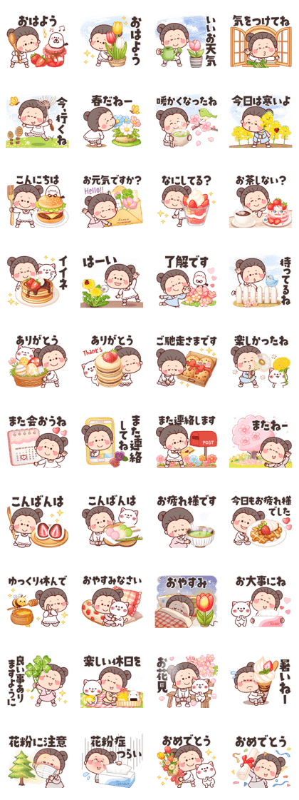 「ふんわり優しい春★可愛いばぁばの日常」は春の穏やかさが感じられて和みますね。心が強張ってしまう災害や事故や事件など冷え冷えする出来事があっても、季節は優しく移ろいで春はちゃんと来るのです。土筆、桜、タンポポ、菜の花、苺、チューリップ、蜜蜂、蝶々、鶯、てんとう虫等春めく様子に心温もり、新たなスタートを思わせる自然の息吹きに健康的な雰囲気が感じられますね。「ありがとう」の感謝の気持ちも暖かく、「お疲れ様です」の労いに報われます。「イイネ」の賞賛に元気づけられ、「ゆっくり休んで」の真心がα波となるヒーリングにリラックスできますね。「また会おうね」の親愛は心の温度差をなくし、「おはよう」の爽やかな挨拶は気持ちを浄化するマイナスイオンで落ち着けます。「おめでとう」の喜びに希望が見えますね。この癒し度の高いスタンプは、みんなを明るく楽しくし、心を春のようにウキウキさせます。このスタンプでみんなにときめく季節感を届けて、春のように優しく暖かく癒し、気分も新たにリフレッシュしてもらいたいですね。(2025/05/20 16:51)