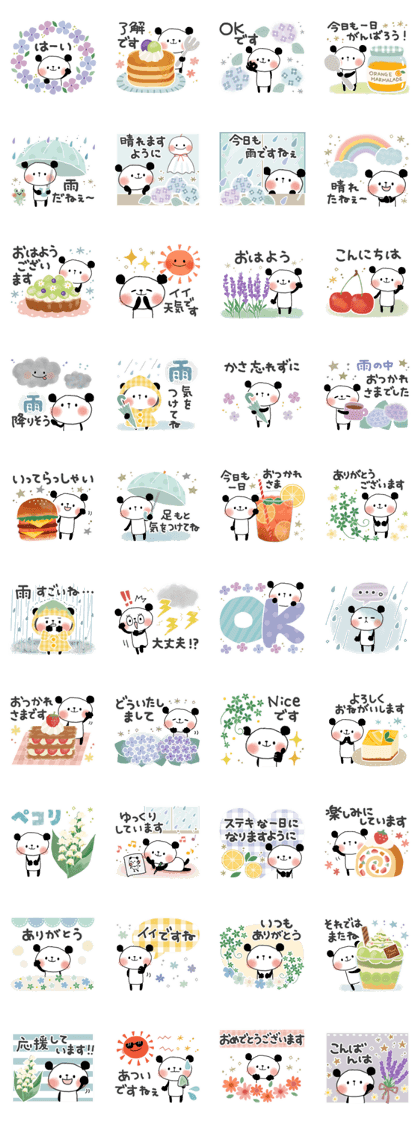 パンダの透明傘?や雨粒の質感、にじむような配色が上品で、北欧調にも見える落ち着いた雰囲気。梅雨をテーマにしながらも、季節を問わず使えそうな「ありがとう」「またね」といった定番メッセージが揃っているのが強み。季節限定では終わらない、日常に溶け込むタイプ。(2026/02/26 02:46)