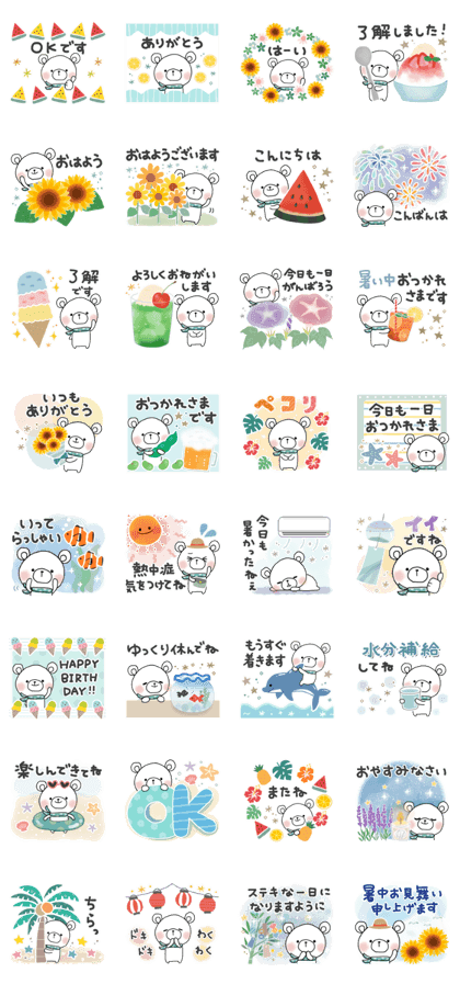 「暑中お見舞い申し上げます」や「熱中症気をつけてね」といった、季節のイベントや注意喚起のメッセージも、しろくまさんの優しい表情で柔らかく伝わります。堅苦しくなりがちなメッセージも、可愛いイラストのおかげで、親しみやすく受け取ってもらえるでしょう!(2026/03/05 02:19)