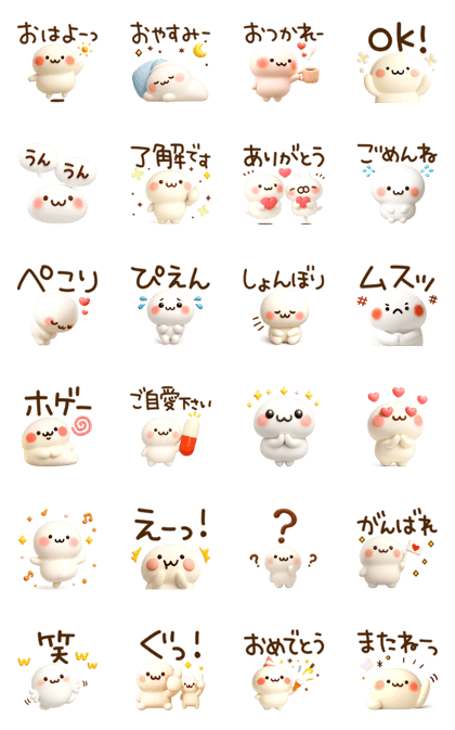 「とびだす♪ぷくぷく3D♪まるにゃん♪」は厳しい現実に疲れた人が気持ちを休める事ができるスタンプですね。仕事、人間関係、災害、事故、事件等の不安と緊張で強張った心をほぐしてくれます。しかも、楽しいイラストに真心のメッセージが歓迎してくれるみたいで嬉しいですね。「ありがとう」のお礼に達成感や「おつかれー」の労いに満足感を感じますね。「がんばれ」の激励は心の糧!「ご自愛下さい」の優しさでマイナスイオンが届いてリラックスできます。「またねーっ」の親愛は心の距離を縮め、「ごめんね」の誠意に気持ちも浄化!「おめでとう」の喜びは希望への活力!様々な出来事でギスギスするときも、みんなにα波を運ぶこのスタンプのセラピー効果でリフレッシュでき、気持ちも穏やかに落ち着きますね。明日の英気も養え、お互い思いを通わす事で心が一つになりますね。協力して頑張れば幸せは必ず来ます。このスタンプでエールを交換し、励まし合い、助け合え、前向きに明日へと歩み出せますね。(2025/09/03 10:07)