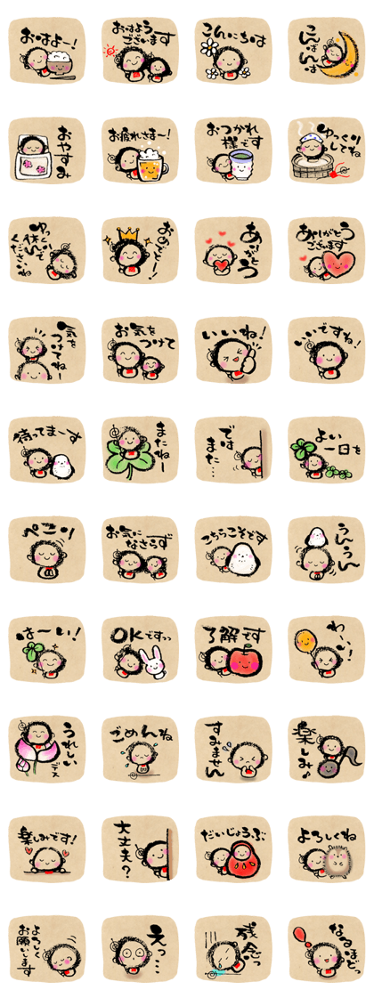 こちら『お地蔵さんの毎日スタンプ』は、にっこり笑うお地蔵さんが描かれ、温かな雰囲気に溢れてる!皆の無事をいつも優しく見守ってくれる、親しみやすいお地蔵さん!ピンクのほっぺと赤い前掛けが可愛いな!端的でシンプルな日常言葉がお地蔵さんに添えられ、しかも味わい深い筆文字!まるで1つ1つが絵手紙の様で、送っても送られても心がほっこり和みます(^^) よく使う日常コメントが敬語とフレンドリーの両方の表現が揃い、シーンに応じた スタンプ選びが出来るのも嬉しいポイント!穏やかなお地蔵さんに癒されながら、和の趣きも楽しめる可愛いスタンプですね!(≧∇≦)(2025/09/17 22:38)