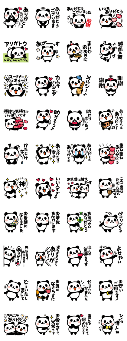 「ぶなんなパンダ/ありがとう」はお世話になってる方へ謝意が伝えられて有難いです。災害、事故、事件など不安な日々!困ってるとき、みんなに親切にされ、助けられ、支えられて助かってます。そんな深謝の思いが届けられて嬉しいですね。色々な状況で「ありがとう」が生かされ、「あざーっす」「まいどおおきに」「カムサハムニダ」「メルシー」「感謝です」「ありがとうございます」「感謝の気持ちでいっぱいです」等ケースバイケースで様々なお礼のメッセージを届ける事は気持ちのいいものです。「お世話になりました」の労い、「かまへんかまへん」の激励、「お気になさらずに」の優しさ、「ひとつ「借し」ねメモメモ」の親愛、「ペコリンちょ」の誠意、「神」の喜びも、「ありがとう」の感謝に彩られ、真心が胸に応えますね。「ありがとう」の思いはスポーツマンシップのように清々しく頑張りを讃えるエールで、α波となって心を癒す抜群のヒーリング!このスタンプは単なる大人としての礼儀や常識に止まらず、絆を強めて人間関係をスムーズにしますね。(2025/11/20 06:34)