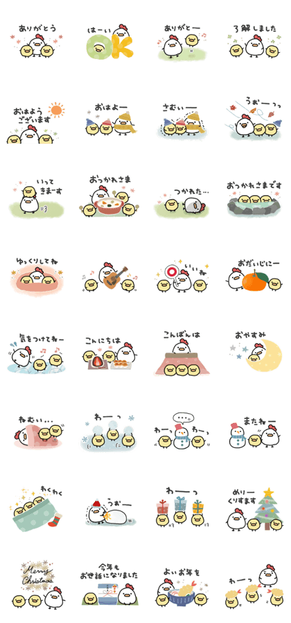 「使いやすい*にわとりサン&ひよこサン*冬」は、見ているだけで心がほんわかする、あたたかみたっぷりのLINEスタンプです。 にわとりサンとひよこサンの、ゆるくて優しい表情が冬の寒さをやさしく包み込むように癒してくれます。 特に、ふんわりとしたタッチと淡い色合いが魅力的で、送るたびにほっとする気持ちになれるのがこのシリーズの魅力。 「ありがとう」「おつかれさま」など、日常で使いやすい言葉がたくさんそろっているので、どんな相手にも気軽に送れます。 寒い季節のちょっとした挨拶にもぴったりで、トークにやわらかな温度を添えてくれるデザインです。 相手への思いやりを、ほっこりかわいく伝えたいときに大活躍すること間違いなし。 にわとりサンとひよこサンの掛け合いにも癒され、見ているだけで笑顔になれる冬のあたたかスタンプ。 毎日のトークを優しい雰囲気にしたい方に、ぜひおすすめしたい作品です!!(2025/11/16 12:16)