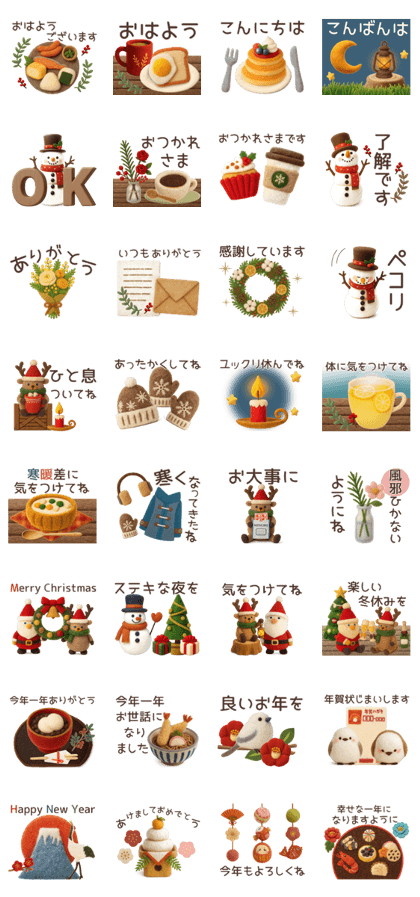 「冬のぬくもり便」は、その名の通り“あたたかさ”がぎゅっと詰まった、とても優しい雰囲気のLINEスタンプです。ほっこりしたタッチと柔らかな色合いが、冬の日常にそっと寄り添ってくれるようなデザインが魅力的。挨拶から労いまで使いやすい言葉が揃っていて、毎日のちょっとしたメッセージにとても便利です。キャラクターたちの穏やかな表情が、見る人の心までふんわり温めてくれます。送るだけで相手にもぬくもりが伝わる、冬にぴったりの優秀スタンプ。季節の会話をやさしく彩ってくれる、心休まるセットです。(2025/11/14 13:01)