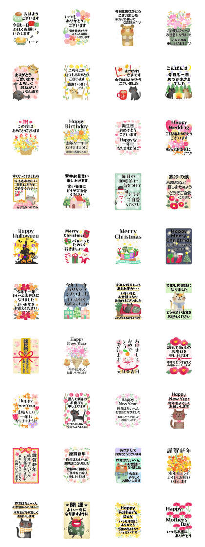 「【Big】冬のご挨拶*毎年使える保存版①」は、見やすいBIGサイズで気持ちがしっかり伝わる、とても頼れる冬スタンプです。 落ち着いた色合いと上品なデザインが、大人でも使いやすいのが魅力的。 「おはよう」や「ありがとう」など、冬の挨拶が丁寧にそろっていて日常使いにぴったりです。 季節感もしっかりありつつ、毎年繰り返し使えるシンプルさがうれしいポイント。 相手への気遣いが自然と伝わる、やさしい雰囲気のメッセージが多いのも好印象。 大きくて読みやすいから、忙しいときでもサッと送れて便利。 冬の定番として、ひとつ持っておくと間違いなく活躍するスタンプですね(⋈◍>◡<◍)。✧♡(2025/11/24 11:33)