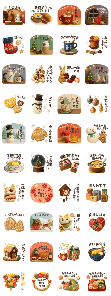 「【3D】北欧かわいい日常・冬」は、見た瞬間に心がほっとするような、あたたかみと立体感にあふれたスタンプです。 3Dの柔らかな質感が、まるで小さなぬいぐるみが話しかけてくるような可愛らしさを演出しています。 北欧テイストの落ち着いた色使いとシンプルなデザインは、どんな相手にも送れる上品さがあり、大人でも使いやすいのが魅力です。 「おつかれさま」「おはよう」「あたたかくしてね」など、冬の日常にぴったりのメッセージが揃っていて、日々のちょっとしたやりとりに重宝します。 また、文字の配置やバランスも美しく、トーク画面での見栄えがとても良いのもポイント。 送るたびに気持ちがやさしく伝わり、寒い季節のコミュニケーションをあたたかく彩ってくれます。 季節感と癒しを兼ね備えた、センスの良い冬スタンプ。 北欧のぬくもりを感じたい人、シンプルで可愛いものが好きな人に、ぜひおすすめしたい作品です。(2025/11/06 10:22)