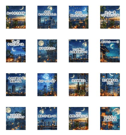 ノスタルジック~~~!!「キャンドルと月の街---1日の終わりに---」は、まるで夜の静けさをそのまま閉じ込めたような、幻想的で癒されるLINEスタンプです。 柔らかい光を放つキャンドルと、静かに見守る月の組み合わせが、1日の疲れをそっと包み込むような優しさを感じさせます。デザイン全体に漂う穏やかなトーンと繊細な色づかいは、見るだけで心が落ち着くほど。 メッセージの言葉選びも丁寧で、「おつかれさま」「ゆっくり休んでね」など、相手を気遣うフレーズが中心。夜の時間にぴったりの言葉が多く、癒しや安らぎを贈りたいときに重宝します。 上品で感性豊かな世界観が美しく、大人の会話にも自然になじむセンスの良さが光ります。1日の終わりを温かく締めくくるのにぴったりの、心に灯をともすようなスタンプですね(⋈◍>◡<◍)。✧♡(2025/11/10 11:44)
