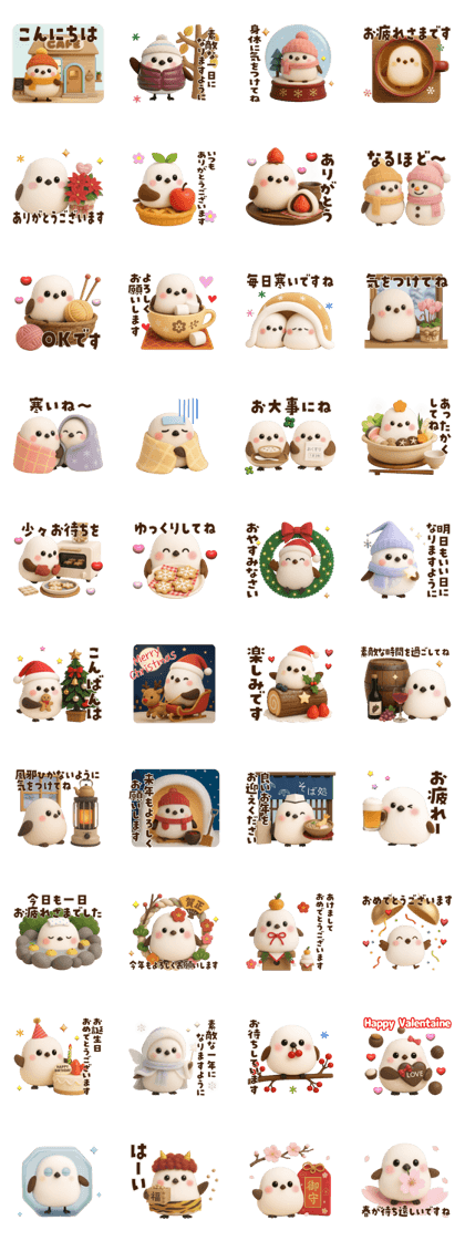 冬の気配が漂う中『【冬のやさしい言葉】3D♡シマエナガさん』登場!白くて小さなシマエナガさんがぷっくら立体的な3Dになって、冬の優しいメッセージを届けてくれる!暖かニット帽にマフラー巻いて寒さ対策バッチリ!鍋料理やストーブなど冬のアイテムに溶け込んで、元気に過ごすシマエナガさんは愛らしさ全開!(^^) しかも、クリスマスや年末年始、お正月、更には節分スタンプまでセットされ、情緒ある冬のイベントが準備万端整います!♡3Dでほっこり感が一層プラスされ、マイルドな癒し効果は絶大!もふもふなシマエナガさんが寒〜い冬を温めてくれますね!(✯ᴗ✯)(2025/11/12 22:18)