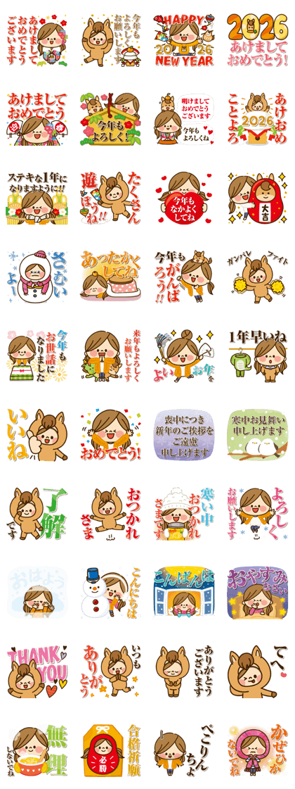 「かわいい主婦の1日 【2026年末年始編】」は、見ているだけで癒されるスタンプです。 かわいい女の子の表情がとても豊かで、感情が一瞬で伝わります。 年末年始らしいシーンが多く、季節感を楽しく使えるのが魅力です。 やさしくてほんわかした雰囲気が、トーク全体を明るくしてくれます。 日常使いもしやすく、挨拶スタンプとしても大活躍します。 主婦目線の共感できる仕草が、思わずクスッと笑えます。 かわいさと実用性を両立した、ぜひおすすめしたいスタンプ(⋈◍>◡<◍)。✧♡(2025/12/27 13:18)