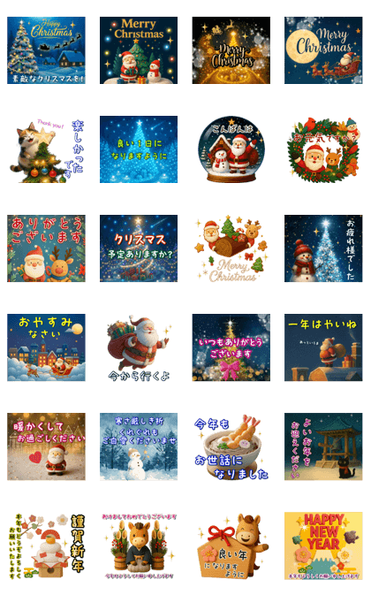 「クリスマス&年末年始とお正月セット」は、季節感満載の便利なスタンプです。 クリスマスからお正月まで、長く使えるラインナップが揃っていて毎日のトークで大活躍。 可愛らしいキャラクターや華やかなデザインが、メッセージに彩りを添えてくれます。 挨拶やお祝いの言葉が充実していて、送るだけで相手に気持ちがしっかり伝わります。 柔らかく優しい色合いで、大人も子どもも使いやすいのが魅力です。 イベントシーンだけでなく、日常のちょっとした会話にも自然に馴染みます。 一年の終わりから新年まで、心温まるコミュニケーションを演出できるスタンプです。(2025/11/21 11:03)