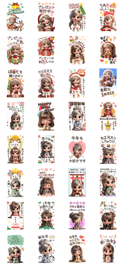 「【BIG*】ずっと使える!クリスマス&お正月」 でっかすぎて画面パーン!ってなるしんよ~←クロちゃんかっw スタンプの大きさがBIGで存在感バツグン! クリスマスのキラキラも、お正月の華やかさも全部詰まってて、 送るだけでトーク画面が一気にお祭りモードに♪ 文字も読みやすくて、日常の挨拶から年末年始のごあいさつまで超便利。 しかも、美女デザインだから見てるだけでほっこり♡ アドリブ入れると、「でかすぎワロタ!トークがパーティー会場やんしんよ~」 毎年使えるから冬のLINEがもっと楽しくなる、最強スタンプやん!(2025/12/05 07:58)