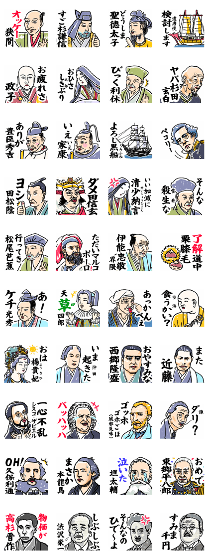 歴史に残る偉人達が、駄洒落と絡んでちょっぴりクセ強のスタンプになって登場〜!日本史の教科書に載ってた聖徳太子、戦国武将、幕末の獅子など歴史好きにはまさにお馴染みの偉人ばかり!「あ!ケチ光秀」「びっく利休」「ダリ?」「すみま千円」「いい加減に清少納言」・・わ〜写実的に描かれた偉人達と子供も大喜びしそうな駄洒落のコラボは面白過ぎて大ウケ!挨拶代わりに毎日送ったら、きっと大盛り上がりしそう!歴史に詳しく偉人好きな友人は多いので、目が点になるかも!想像しては笑いがこぼれてます(*^^*)(2026/03/06 10:27)