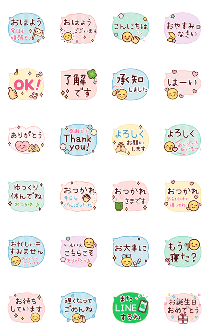 第1印象は、淡いパステルカラーで優しい雰囲気だな〜(^^) こちら『うごく!大人のやさしいデカ文字』はシンプルな吹き出しスタイルが特徴!ふんわり丸みのある吹き出しの中にはデカ文字で表された基本的な日常ことばや連絡用語がふんだんに揃ってる!側には小さめの可愛い絵柄が彩り、とっても愛らしい!しかも動きまで付いて、 シンプルで温かくほっこり和みます!(^^*) 忙しい毎日の生活に、パッとひと目で見やすくてトークも楽しく進みそうで嬉しいですね!(≧∇≦)b(2026/04/15 13:09)