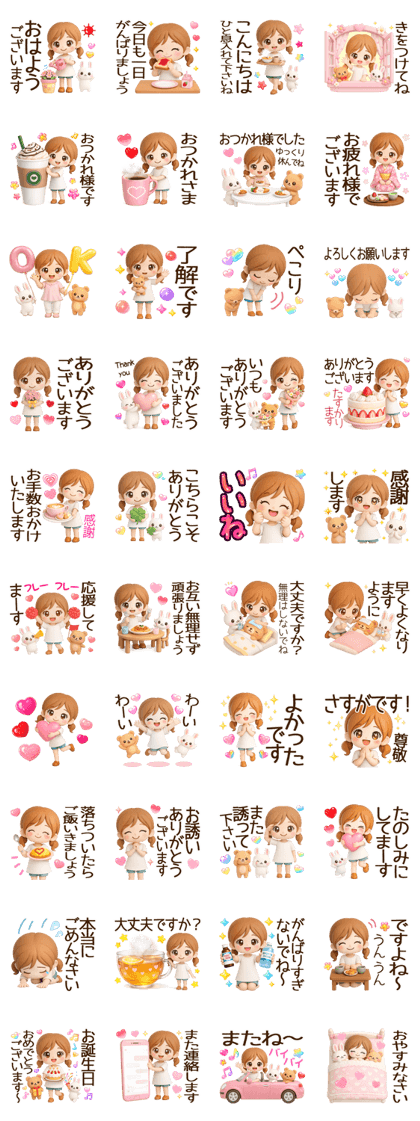 ふんわり優しいタッチで、見た瞬間ほっとするスタンプだよ。 言葉づかいがやわらかくて、誰に送っても角が立たない安心感がある。 日常のちょっとした気遣いや「ありがとう」を伝えるのにちょうどいい。 キャラの表情が絶妙で、送る側も受け取る側も気持ちがゆるむ。 トークの空気をふわっと明るくしてくれる“癒し系”の存在感が強い。 毎日使いたくなる、やさしさがぎゅっと詰まったセット(⋈◍>◡<◍)。✧♡(2026/04/03 11:54)