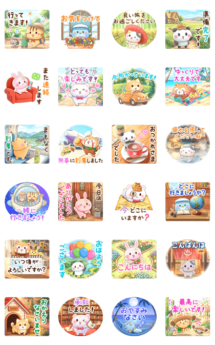 ゆったり温泉気分の世界観がそのまま飛び出してきて、まず癒し度が高い。 ぽわっとした動きが可愛くて、送るだけで相手の力がふっと抜ける感じがいい。 「いってきます」「おつかれさま」みたいな日常フレーズが揃ってて使いやすさ抜群。 色味もやわらかくて、トーク画面がほのぼのムードになるのが嬉しい。 押しつけがましくない“ゆるさ”が絶妙で、誰にでも送りやすいのが強み。 おでかけ系だけじゃなく、普段のやり取りにも自然にハマる万能さがある。 癒し+実用性のバランスが最高で、常備スタンプにしたくなるタイプだよね(⋈◍>◡<◍)。✧♡(2026/04/25 11:17)