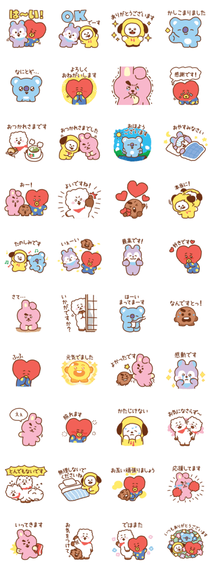 『BT21 ほっこりやわらか敬語スタンプ』は、見ているだけで心があたたまる癒し系スタンプです。 BT21のキャラクターたちが、やわらかいタッチと優しい色合いで描かれていて、どの表情もとても愛らしい!「ありがとうございます」「おつかれさまです」などの丁寧な敬語がそっと添えられており、日常のやり取りにもぴったりです。 ビジネスシーンでも友人同士でも使いやすく、LINEでの印象をふんわり優しくしてくれる万能スタンプ。特に、ちょっとしたお礼や励ましを伝えるときに送ると、相手の心もほっこりすること間違いなしです。 BT21の世界観が大好きな人はもちろん、「かわいく丁寧に伝えたい」人にもおすすめの、癒しと気づかいが詰まった素敵なスタンプセットです✨(2025/10/25 10:41)