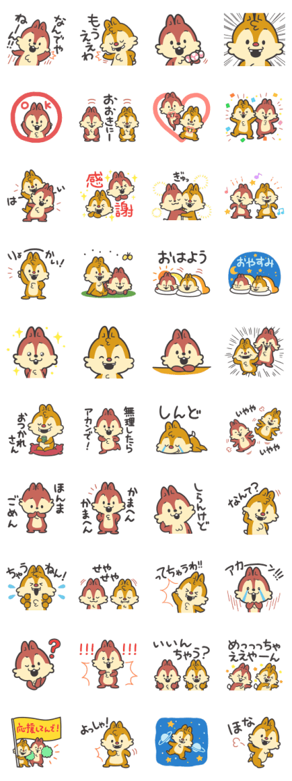 関西弁のチップとデールがとにかく可愛くて、使うたびに笑てまうスタンプです。 ツッコミもボケもキレッキレで、日常会話にめっちゃ使いやすいのが最高。 チップとデールの表情と関西弁の相性が抜群で、破壊力があります。 「なんでやねん!」感が絶妙で、会話の温度が一気に上がります。 友だちとの軽いやり取りから、ノリのええ返事まで幅広く対応。 関西人はもちろん、関西弁好きにもたまらん仕上がり。 トークを明るくしてくれる、持ってて損なしのラインスタンプですねヾ(o´∀`o)ノワァーィ♪(2026/01/15 09:32)